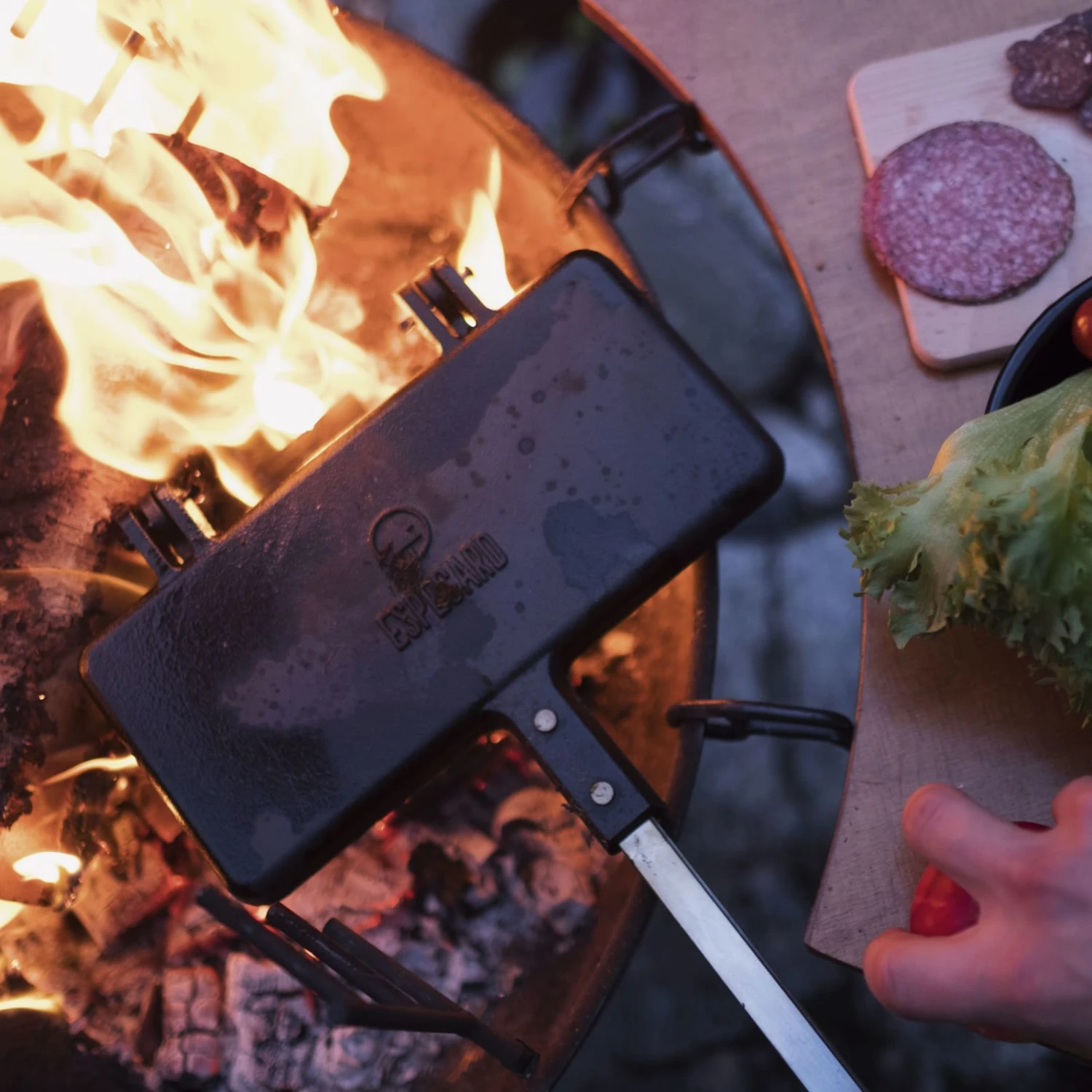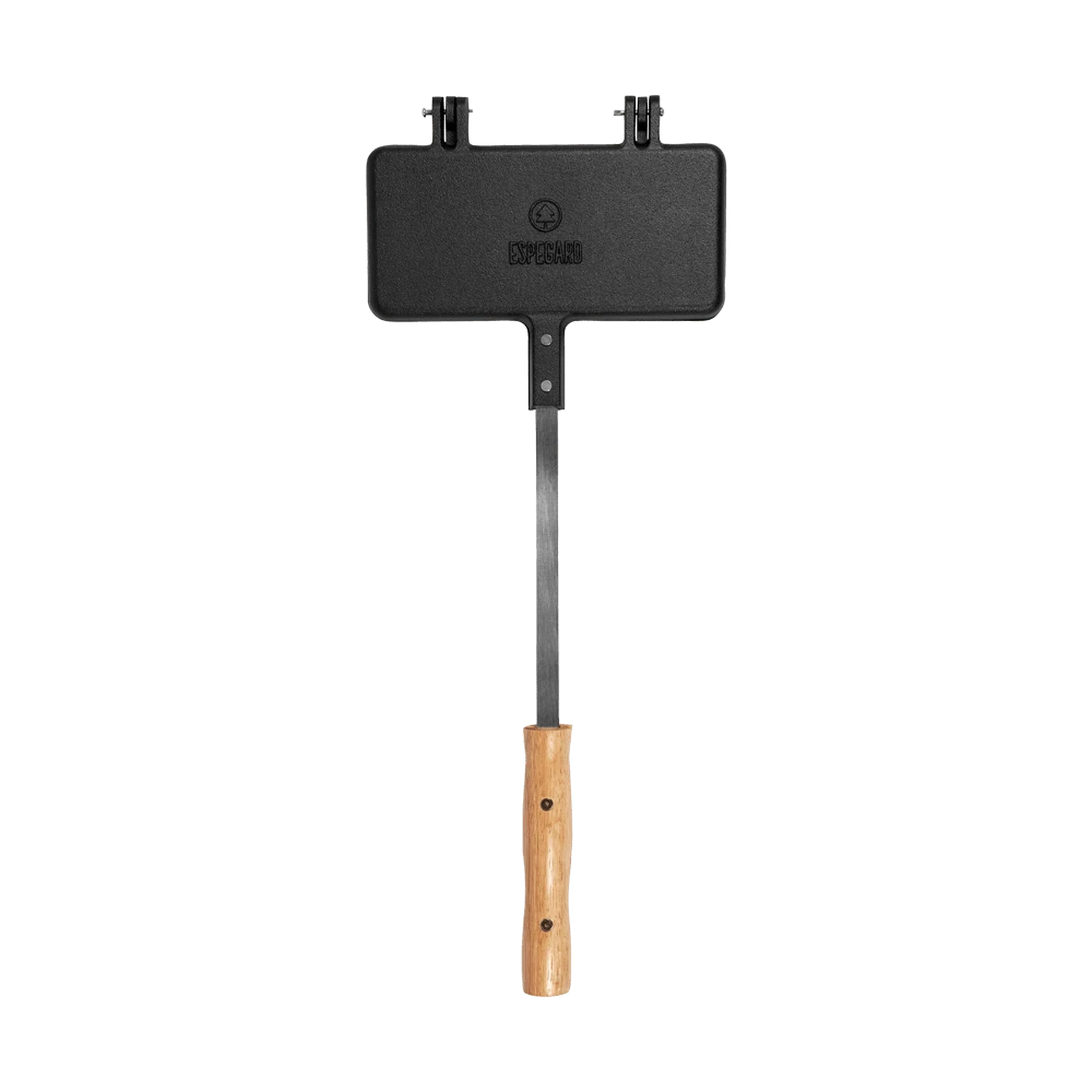 Laget i støpegods med langt stålskaft og håndtak av tre. Legges på grillristen i bålpanna eller direkte på bål. Støpejern blir veldig varmt og holder lenge på varmen. Bruk smør eller matfett ved steiking. Leveres med eget etui. Settes inn med et tynt lag matolje etter bruk og lagres tørt. Farge: Mørk grå. Vekt: 3.1 kg.