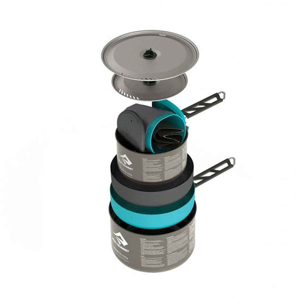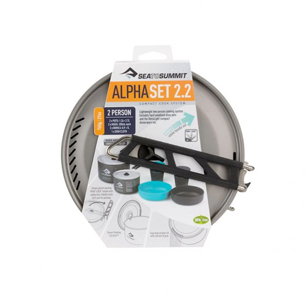 EGENSKAPER Varenavn: Sea To Summit Alpha Set 2.2 Type: Turkjøkkensett Består av: To kjeler, to tallerkner, to kopper m/ lokk, mikrofiberklut Bruk: Tur, piknik Spesielle egenskaper: Lett, sammenleggbart, pakkpart Merknader: Kan ikke brukes over åpen ild, kun brenner. Les instruksjonene før bruk. MATERIALER Materiale kjeler: 100% andonisert aluminium (hard) Materiale dekketøy: 100% BPA-fri copolyester Materiale klut: 100% polyesterfiber MÅL OG VEKT Mål kjeler: 18 cm (2.7 liter) / 14 cm (1,7 liter) Mål tallerkner: 17 (1000 ml) / 16,5 cm 900 ml Mål krus/klut: 8 cm (365 ml) / 30 cm mikrofiberklut Vekt: 797 g (hele settet) -