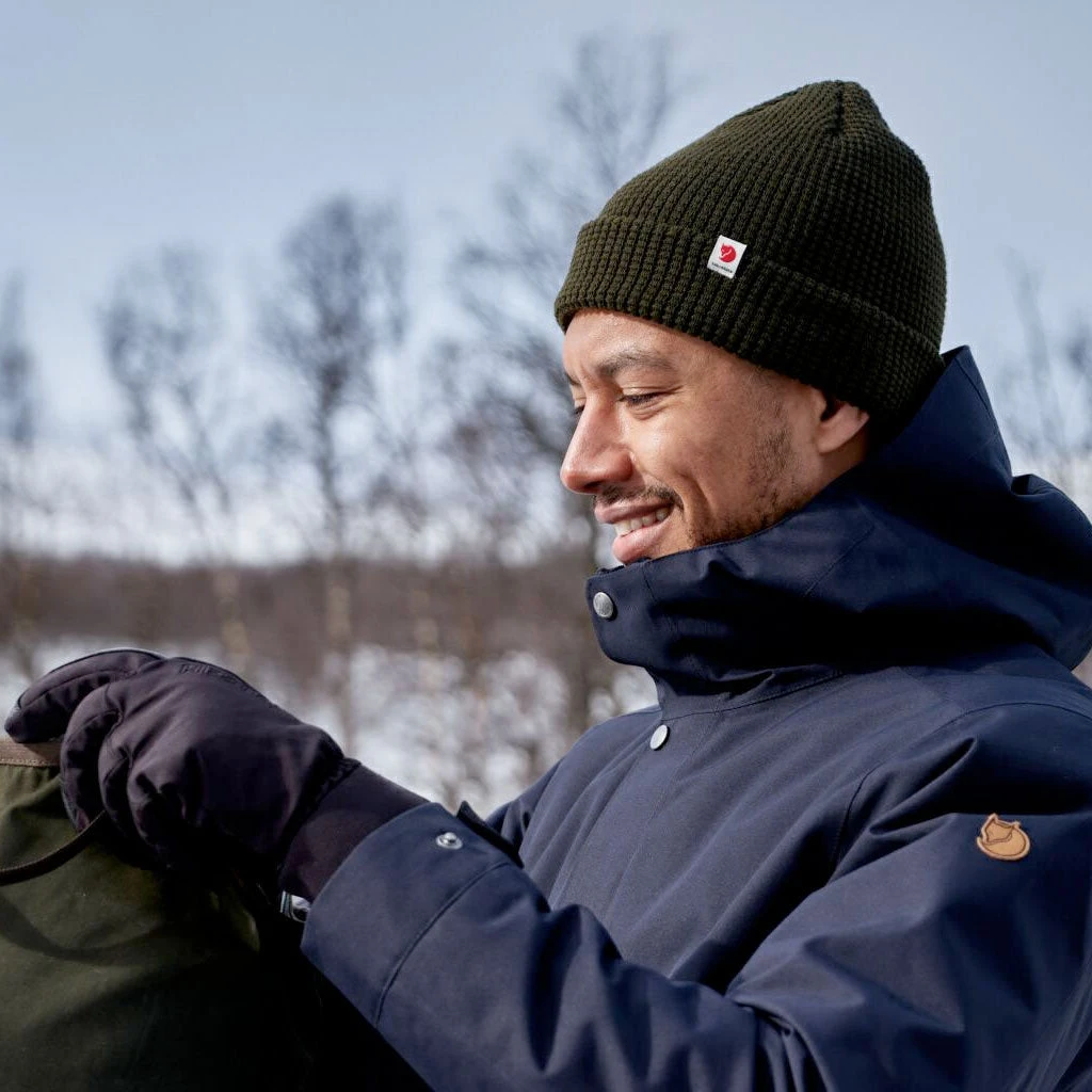 Tab Hat er en vaffelstrikket lue med bred oppbrettbar kant og en liten tekstilflik med den ikoniske Fjellreven-logoen. Materialet er transporterer bort svette og tørker raskt – egenskaper som gjør at dette er en lue som passer like godt i hverdagen som på tur i fjellet.